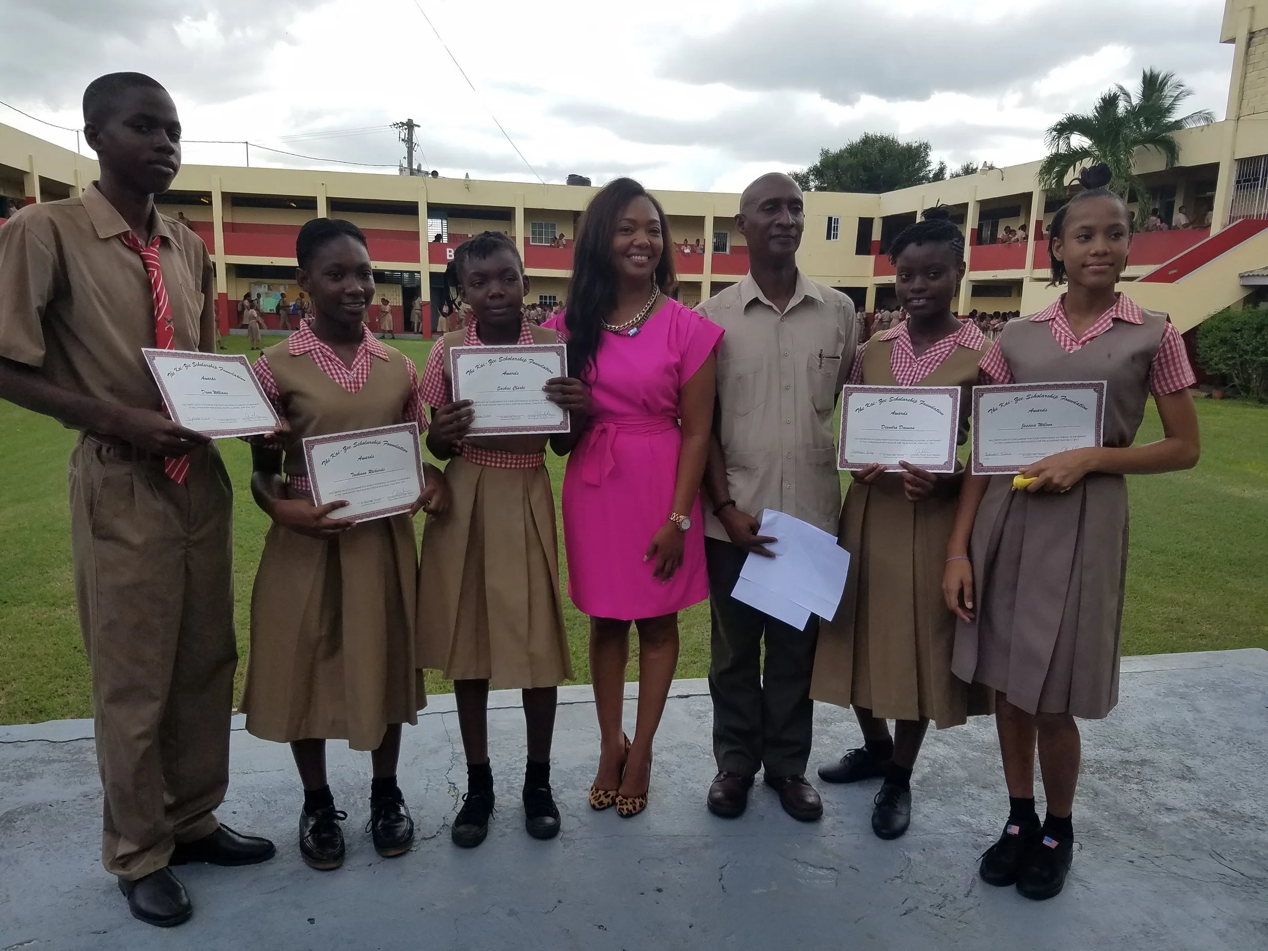 Through this partnership, five outstanding Charlemont High students — Devon Williams, Deandra Doeman, Tashana Richards, Sasha Clarke, and Jessica Wilson — were awarded full scholarships covering school fees, uniforms, supplies, and other essentials for the academic year.